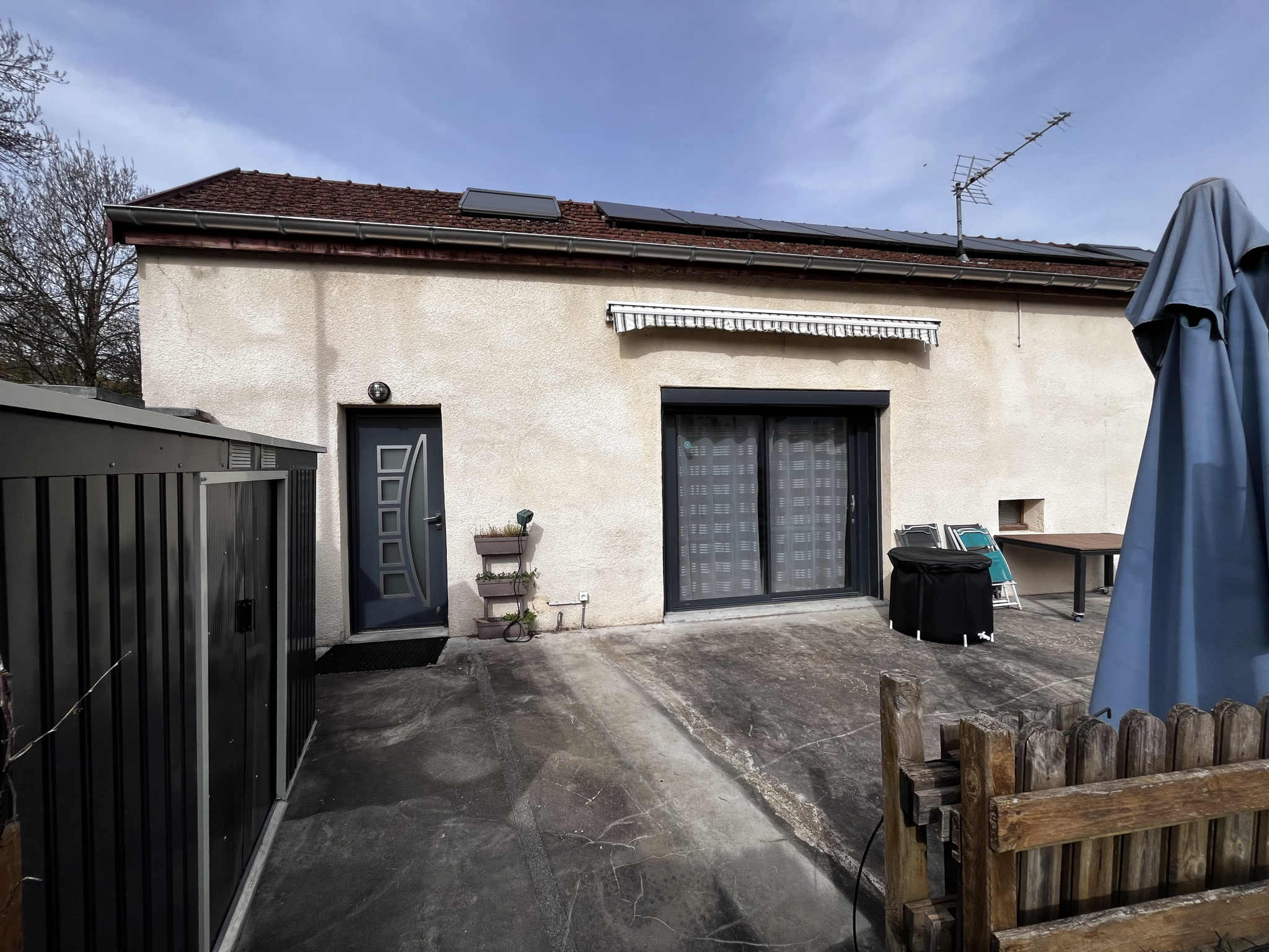 A l'extérieur, une grande terrasse orientée Sud pour profiter des beaux jours, une allée avec plusieurs places de stationnement et deux cabanons de jardin, le tout entièrement clôturé avec portail électrique.